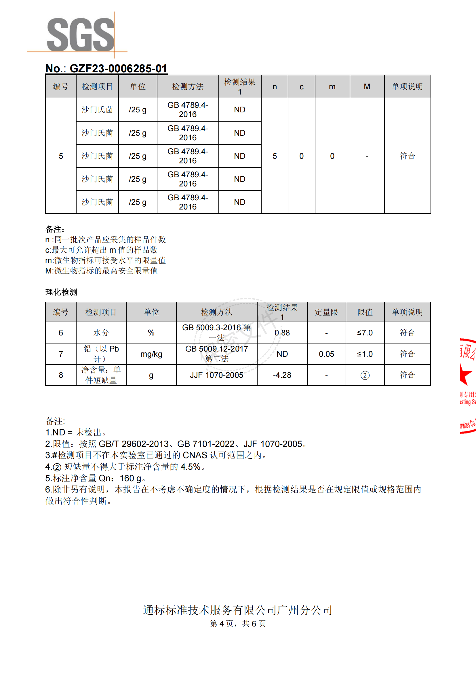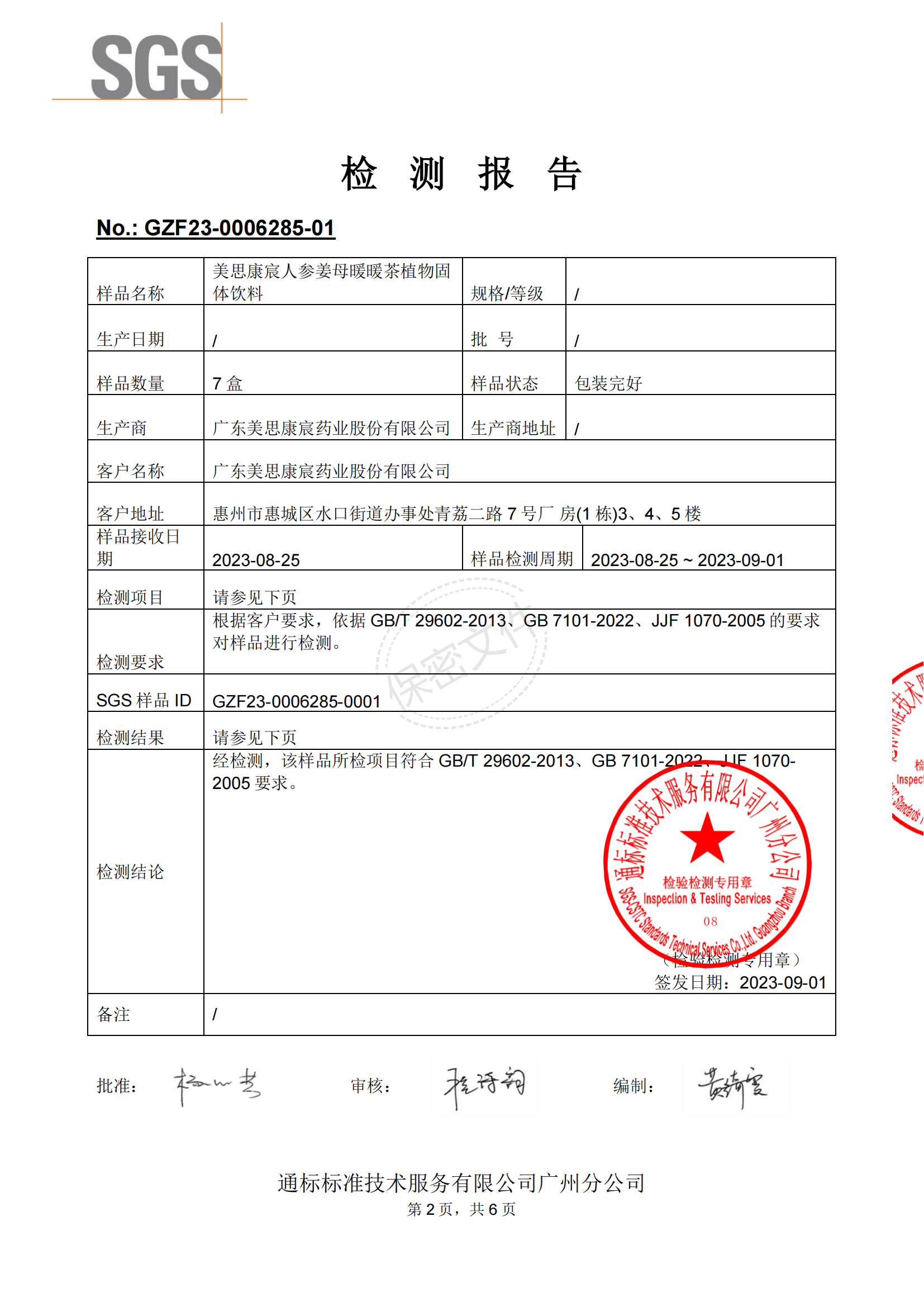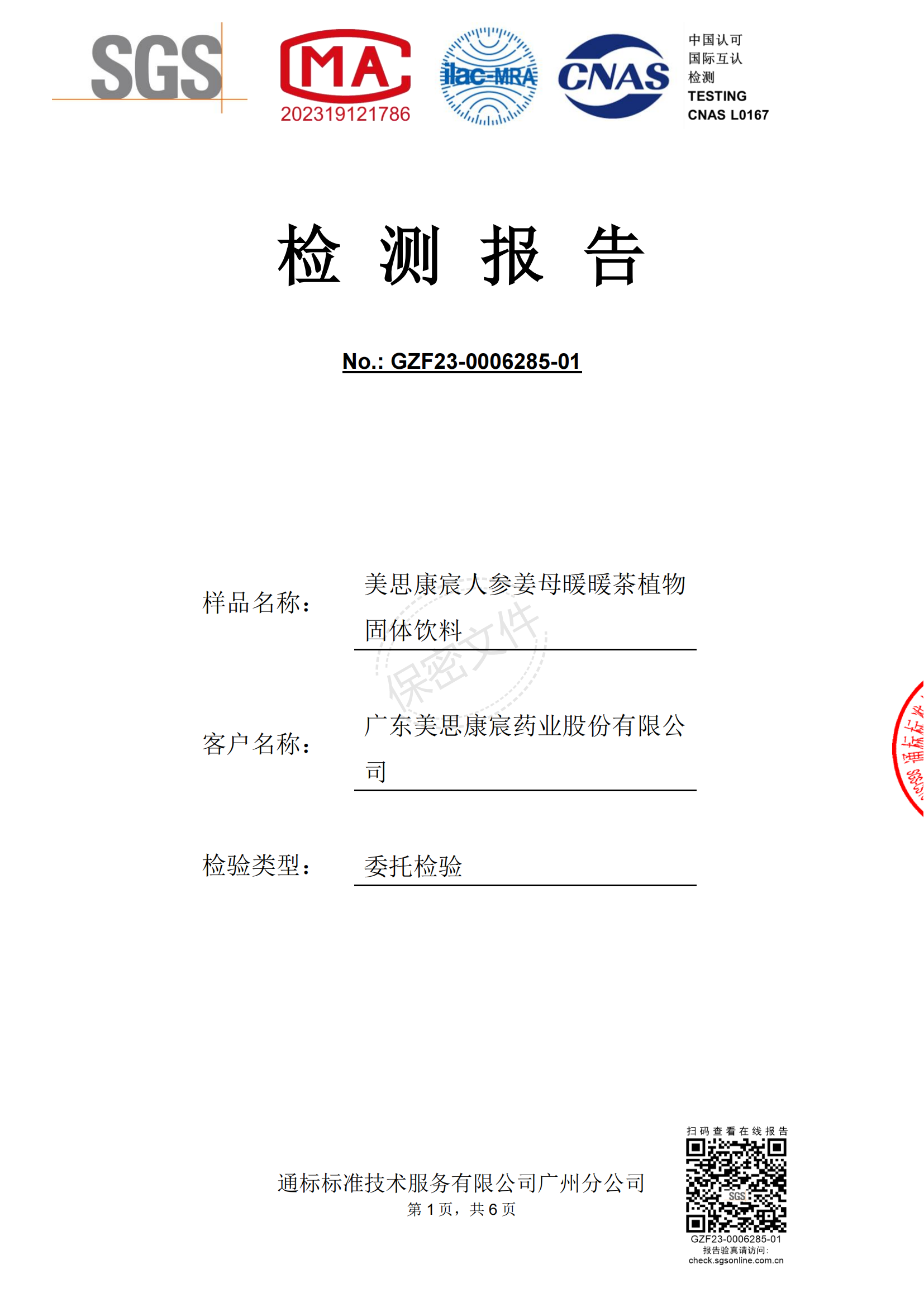 美思康宸人参暖暖茶2023年-2024年SGS检测报告