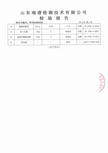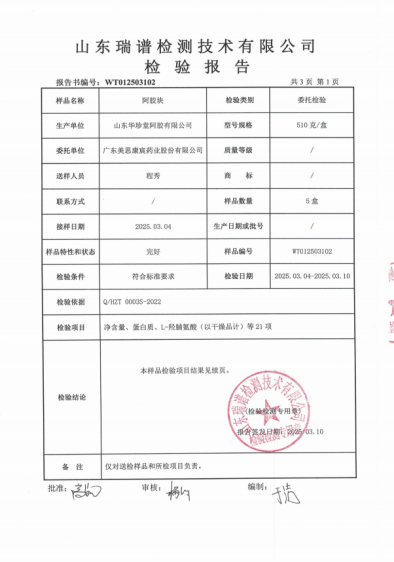 检测结果显示,美宸天胶的铅、砷、汞等有害物质均未检出或远低于安全限值,微生物指标(如菌落总数、霉菌等)更是优于国家标准数倍,确保每一片阿胶都纯净安全。