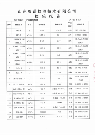 根据最新检测报告(编号:WT012503102),美宸天胶的蛋白质含量高达84.4g/100g,远超国家标准(≥75.0g/100g),为人体提供优质蛋白来源。此外,核心氨基酸如L-羟脯氨酸、甘氨酸等含量均显著高于行业要求,充分体现其原料纯正与工艺精湛。